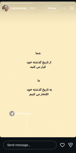طهماسب در این پیام کوتاه اما قاطع نوشت: «شما از گذشته خود فرار میکنید / ما به گذشته خود افتخار میکنیم.»