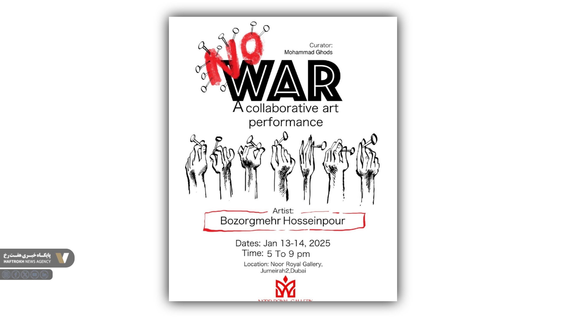 رویداد تعاملی «نه به جنگ» روزهای ۱۳ و ۱۴ ژانویه ۲۰۲۵ (۲۴ و ۲۵ دی) در بازه زمانی ۱۷ الی ۲۱ در گالری نور رویال واقع در جمیرا ۲ دبی برگزار میشود.