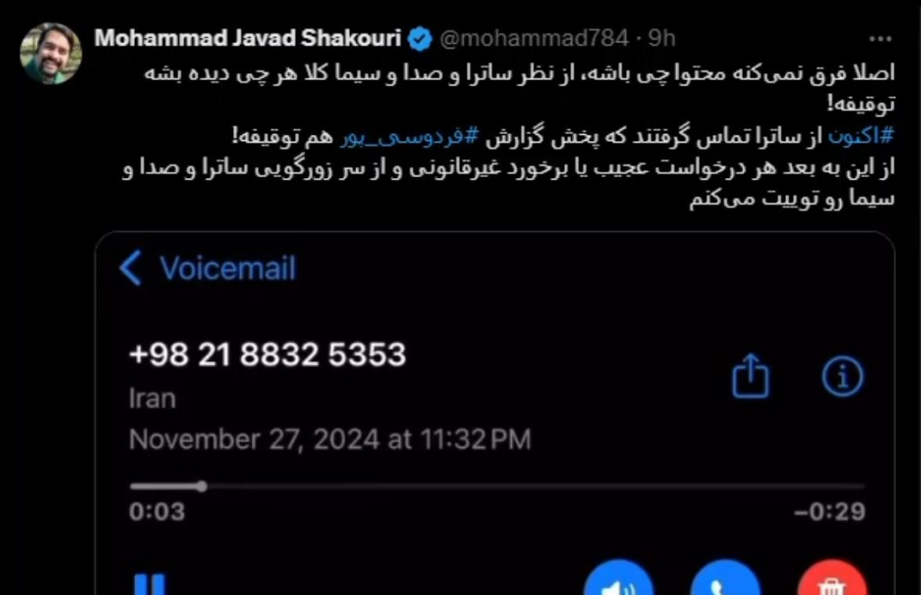 به همین منظور محمدجواد شکوری مقدم مدیرعامل آپارات و فیلیمو با انتشار مطلبی در فضای مجازی از توقیف پخش گزارش عادل فردوسیپور خبر داد. او در صفحه شخصی خود در توییتر نوشت: «اصلا فرق نمی کنه محتوا چی باشه، از نظر ساترا و صدا و سیما کلا هر چی دیده بشه توقیفه! اکنون از ساترا تماس گرفتند که پخش گزارش فردوسی پور هم توقیفه!»
